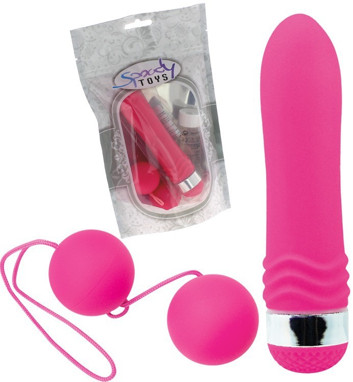 O conjunto incluí um vibrador, bolas geisha e um tubo de gel lubrificante com 20 mililitros.